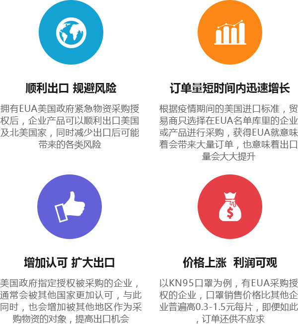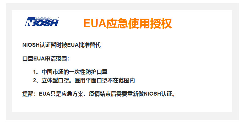 美国FDA曾经将中国标准的KN95口罩排除在EUA授权范围之外,而4月3日,美国FDA在其官网上专门发布针对中国生产的未获NIOSH认证的(口罩)获得EUA授权的文件。 这一新发布的文件,标志着按照中国标准生产的KN95口罩得到美国官方的正式认可。因疫情影响,现专门针对中国KN95型口罩的出台EUA认证,EUA是美国政府紧急物资采购授权,它相当于发一个临时简易合格证替代NIOSH认证。EUA认证权仅在疫情爆发期间有效,NIOSH认证长期有效。疫情期间只有获得EUA授权的疫情物资,才可以出口到美国、在美国办理清关手续。它是疫情期间,中国物资出口到美国的通行证。